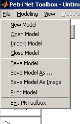 The File menu (fig. I.2) offers facilities for file-handling operations. This is the only menu available when the PN Toolbox GUI is started. This menu contains the commands:
